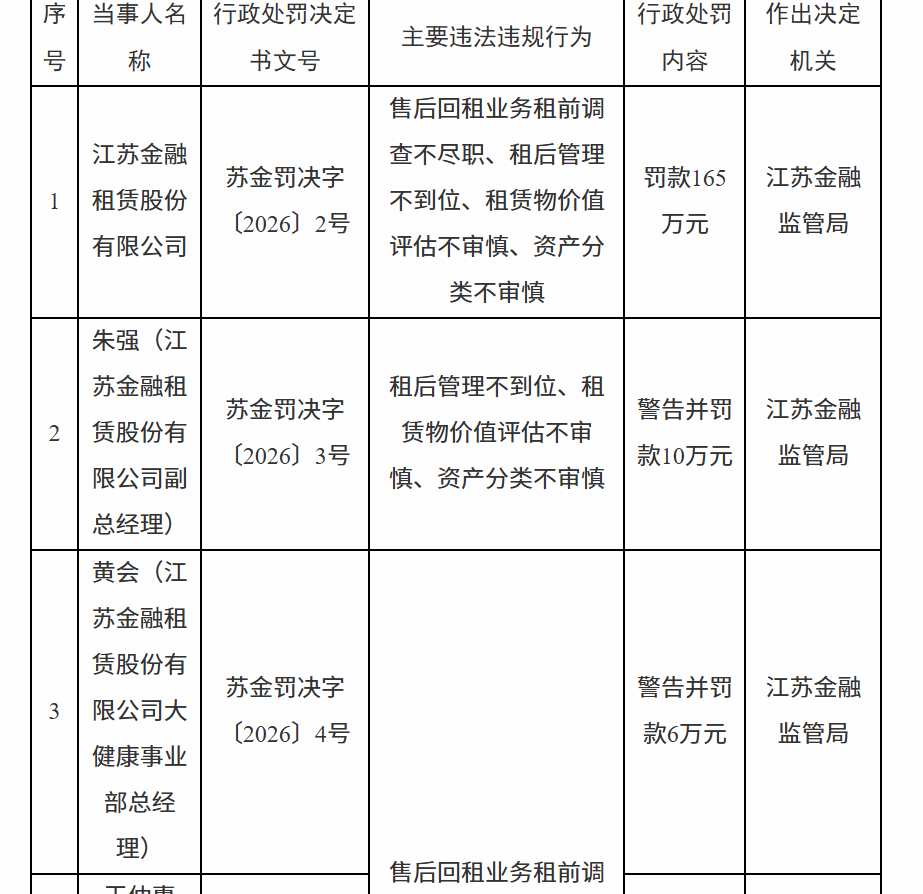 1月28日,国家金融监督管理总局江苏监管局行政处罚信息公开表显示,江苏金融租赁股份有限公司因售后回租业务租前调查不尽职、租后管理不到位、租赁物价值评估不审慎、资产分类不审慎被罚款165万元。责任人朱某被警告并罚款10万元;黄某被警告并罚款6万元;王某惠被警告并罚款8万元。